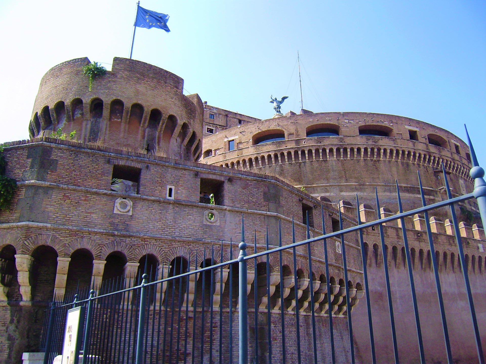 Unido a la otra orilla por el puente más bonitos de la ciudad, y al Vaticano por un largo pasadizo amurallado. El edificio fue concebido inicialmente como mausoleo del emperador Adriano (117-138), pero su sólida estructura y su posición estratégica le han hecho jugar un papel decisivo en las interminables luchas por el dominio de la ciudad. Fortaleza inexpugnable donde se podían resistir los asedios durante meses, ningún invasor podía proclamarse dueño de Roma hasta que no hubiera rendido Sant'Angelo.